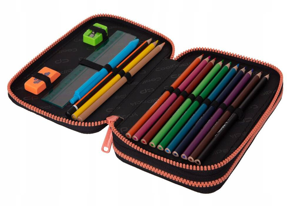 Piórnik dwukomorowy z wyposażeniem, zapinany na zamek błyskawiczny.