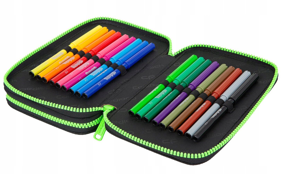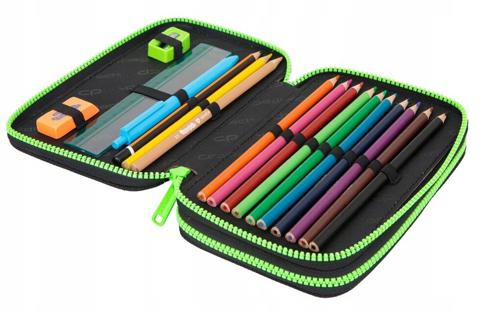 Piórnik dwukomorowy z wyposażeniem, zapinany na zamek błyskawiczny.