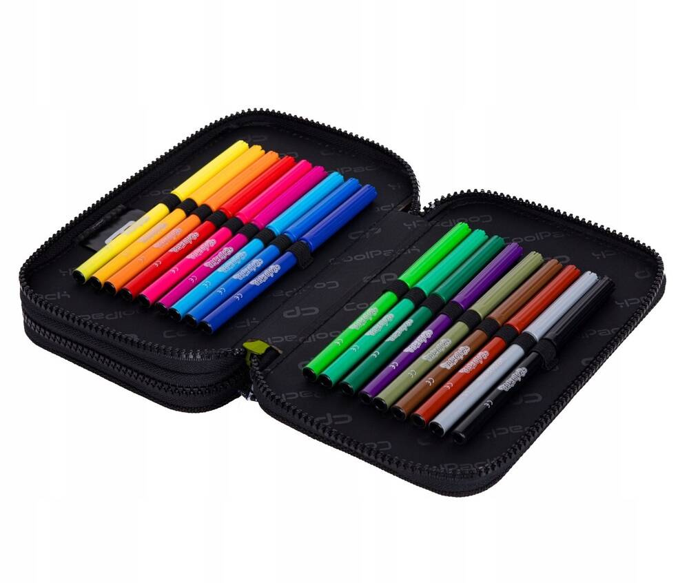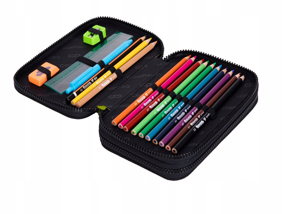 Piórnik dwukomorowy z wyposażeniem, zapinany na zamek błyskawiczny.