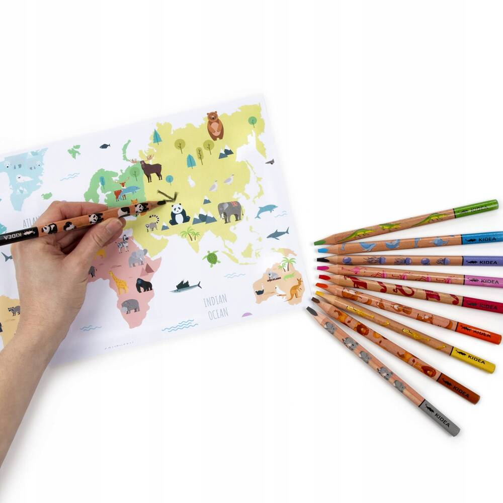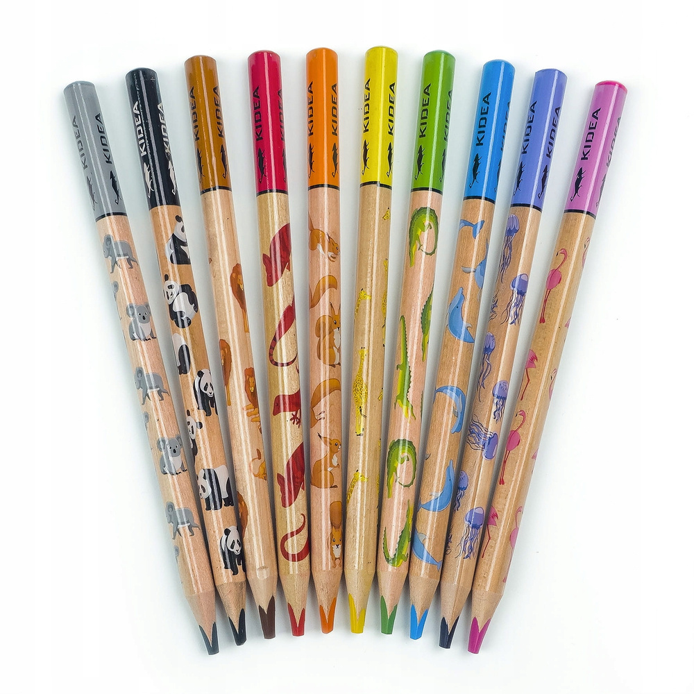Kredki trójkątne ze zwierzętami Kidea. W pudełku znajduje się 10 kolorów kredek: szara, czarna, brązowa, czerwona, pomarańczowa, żółta, zielona, niebieska, fioletowa oraz różowa. Intensywne, dobrze kryjące kolory i miękki rysik sprawiają, że rysowanie staje się jeszcze przyjemniejsze. Ergonomiczny, trójkątny kształt ułatwia pewny chwyt, a realistyczny nadruk dzikich zwierząt, takich jak lew, krokodyl, czy flaming, pozwala dziecku poznać mieszkańców różnych zakątków świata.