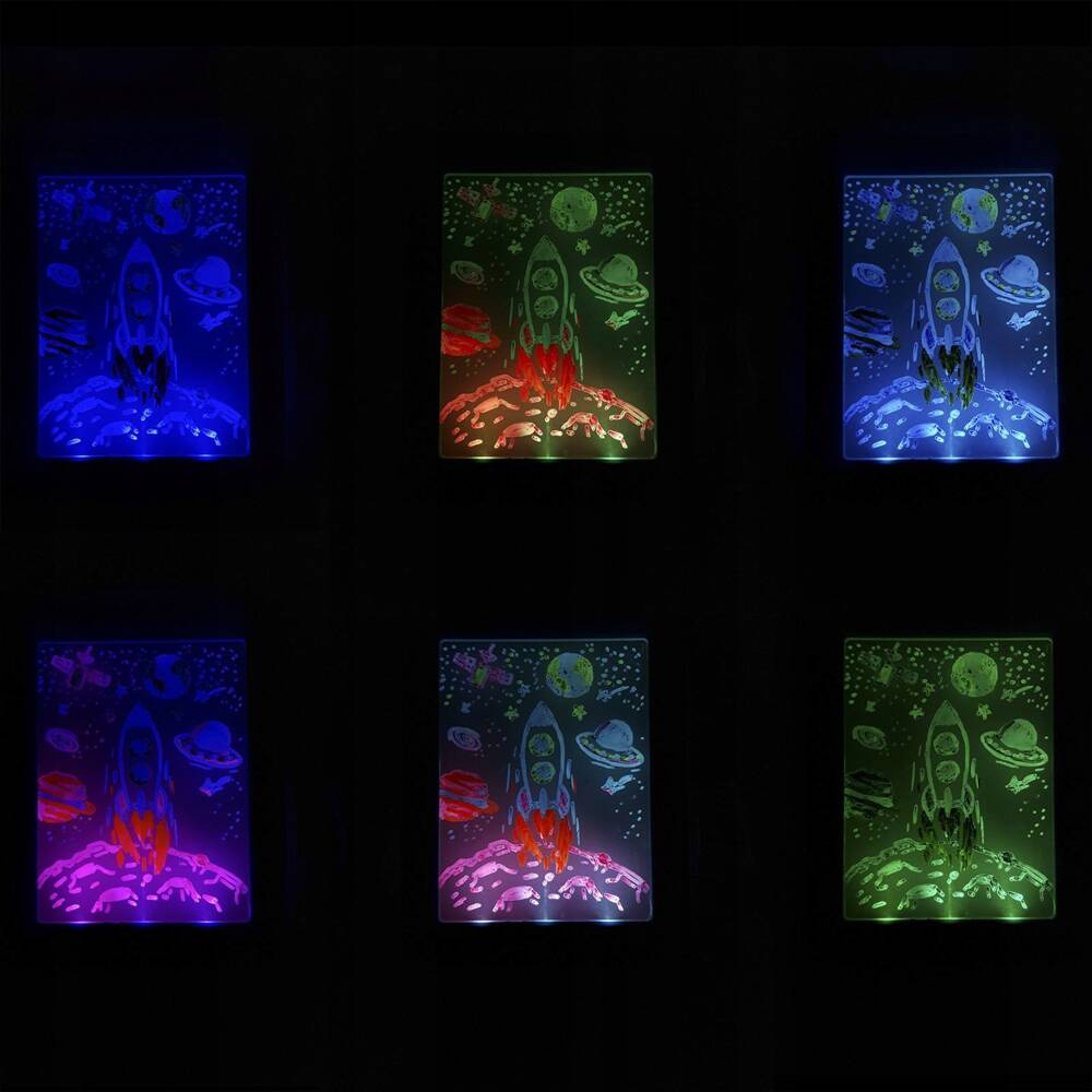 Magiczna neonowa tablica 3D w niebieskim kolorze idealnie sprawdzi się podczas nauki rysowania oraz pisania. Niezwykłą frajdę sprawią dziecku dołączone okulary, umożliwiające podziwianie swoich obrazków w wymiarze 3D. Dodatkowy efekt nadaje podświetlenie LED, aż z ośmioma efektami świetlnymi. Dołączone do zestawu 2 pisaki dwustronne o 4 neonowych kolorach – zielony, niebieski, pomarańczowy i różowy umożliwiają tworzenie efektownych obrazków. Dodatkowo zestaw został wyposażony w ponad 40 ilustracji do odrysowania, które pozwalają tworzyć niezwykłe rysunki, nawet dziecku, które dopiero zaczyna przygodę z plastyką. Wystarczy umieścić szablon za szybką i zacząć kreatywną zabawę. Komplet zawiera również ściereczkę, dzięki której możemy na wilgotno zetrzeć naszą pracę i tworzyć nieograniczoną liczbę kolejnych rysunków. Dzięki poręcznemu kształtowi tablica 3D idealnie sprawdzi się w podróży i umili dziecku każdą wyprawę.
