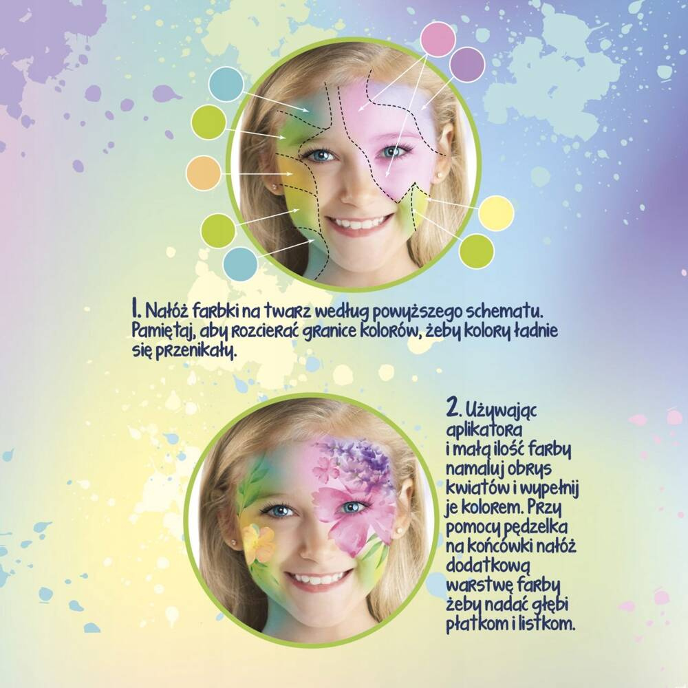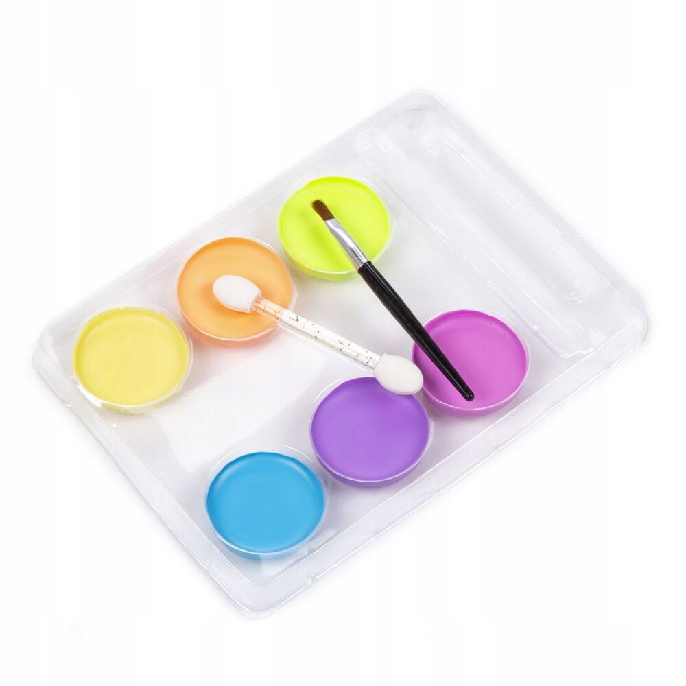 Zestaw 6 farbek do twarzy w modnych pastelowych kolorach – żółtym, pomarańczowym, zielonym, niebieskim, fioletowym i różowym. Są bardzo wydajne i wygodne w użyciu, dzięki czemu farbki wystarczą na pomalowanie wielu różnych stylizacji. Wyjątkowe odcienie pozwolą stworzyć makijaż jedyny w swoim rodzaju! Pędzelek, świetnie sprawdzi się w rysowaniu dokładnych kontur, natomiast większe powierzchnie można pokryć za pomocą aplikatora. Z tyłu opakowania instrukcja jak krok po kroku stworzyć wybraną stylizację. Farbki są bezpieczne w użytkowaniu, co potwierdzają przeprowadzone testy dermatologiczne.