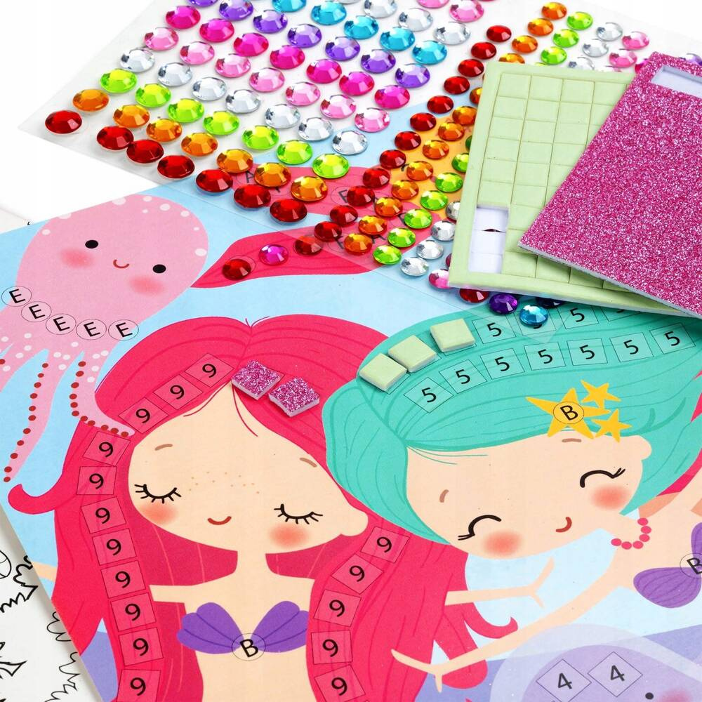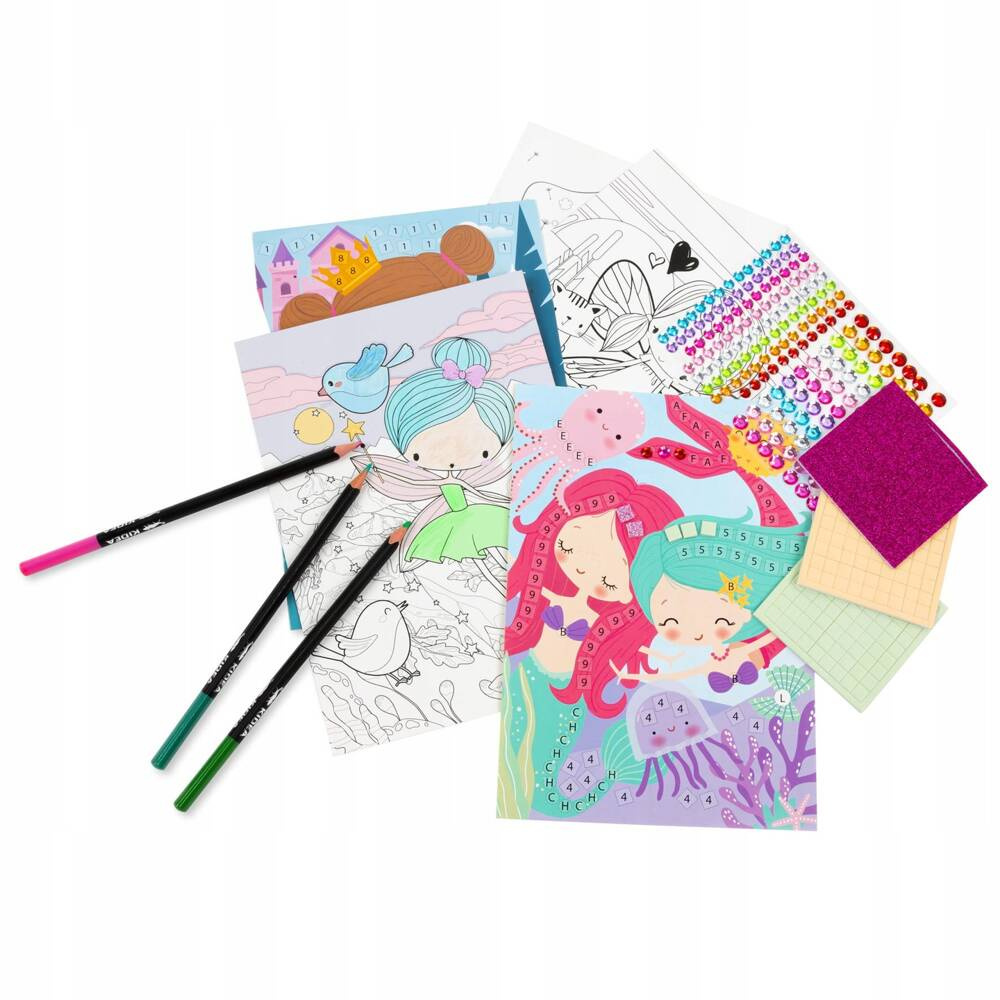 - W zestawie znajdziesz 5 kolorowych arkuszy, które udekorujesz za pomocą dostępnych elementów, takich jak naklejki diamentowe oraz kolorowe i brokatowe naklejki piankowe.