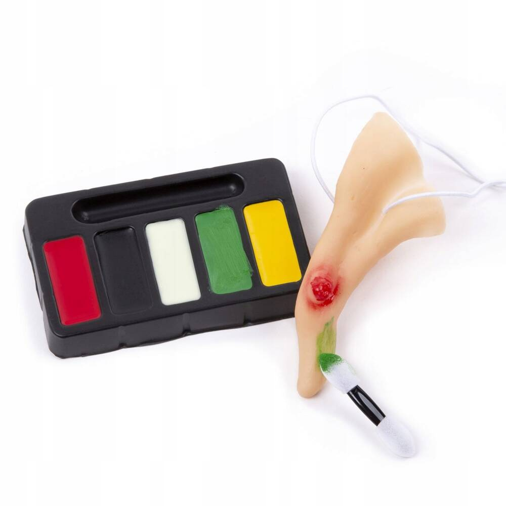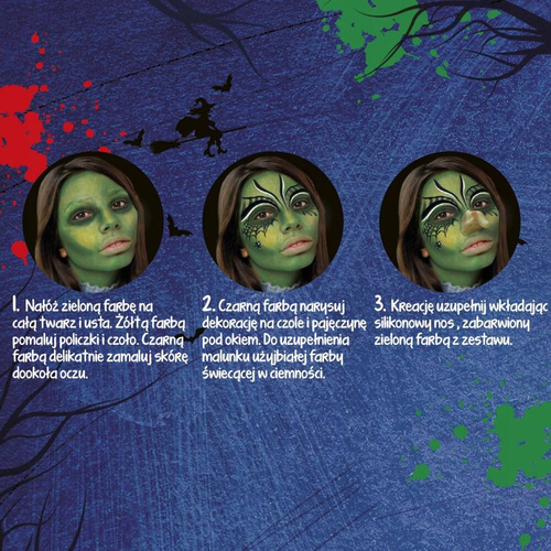 Stwórz wyjątkową stylizację razem z KIDEA! Zestaw wiedźma pozwoli wykonać super charakteryzację! Cały komplet zawiera, aż 7 elementów: nos wiedźmy z gumką, farbki do twarzy w 5 odcieniach, z czego jedna świecąca w ciemności – czerwonym, czarnym, białym, zielonym i żółtym oraz precyzyjny aplikator, który doskonale sprawdzi się w pokryciu większych powierzchni oraz rysowaniu dokładnych kontur. Wszystkie produkty są bezpieczne, co potwierdziły restrykcyjne testy laboratoryjne.