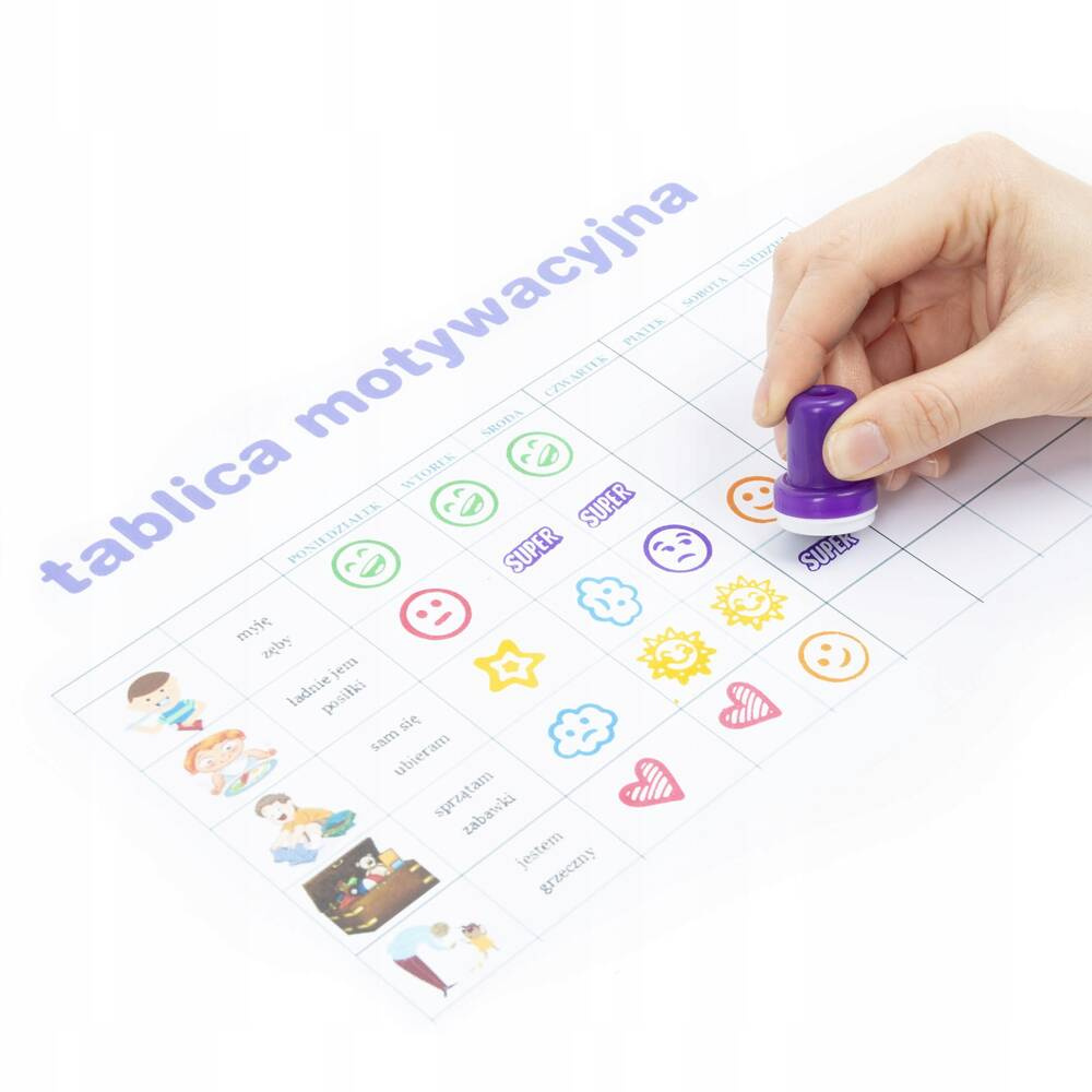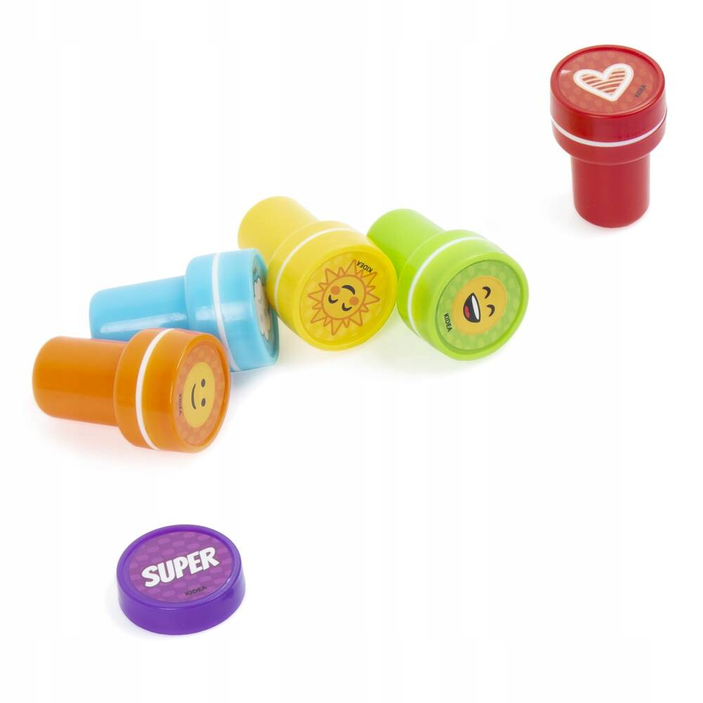 Stempelki dla dzieci z motywacyjnymi emotikonkami od Kidea. W zestawie znajduje się aż 9 pieczątek w różnych kolorach: żółtym, pomarańczowym, czerwonym, zielonym, niebieskim i fioletowym. Stempelki pomogą wyrazić takie emocje jak radość, smutek, znudzenie czy miłość. Doskonale sprawdzą się również podczas oceniania prac dzieci oraz przy prowadzeniu tablicy motywacyjnej i dziennika nastrojów. Stempelki są samotuszujące, co oznacza, że nie trzeba dodatkowo maczać ich w poduszce z tuszem!
