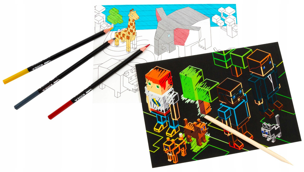 - W zestawie znajdziesz aż 6 wydrapywanek z kolorowankami na odwrocie z motywem z Twojej ulubionej gry oraz drewniany rysik.