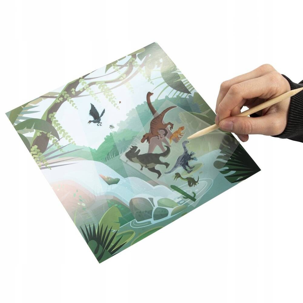 Kalkomania to niezwykle twórcza i prosta zabawa dla każdego! Wystarczy przyłożyć wybraną folię z kalkomanią do arkusza z tłem i potrzeć obrazek drewnianym rysikiem. Odbite na papierze obrazki pozwalają na stworzenie własnej, fantastycznej historii w świecie dinozaurów, rozwijając przy tym wyobraźnię dziecka.
