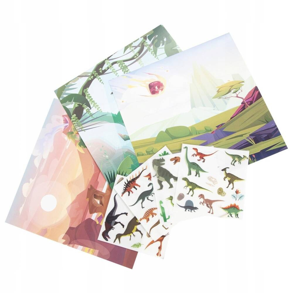 - cztery arkusze folii z kalkomanią z dinozaurami,