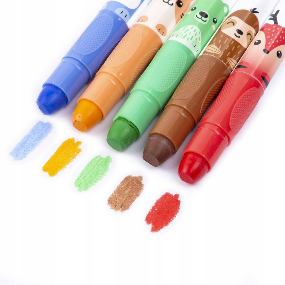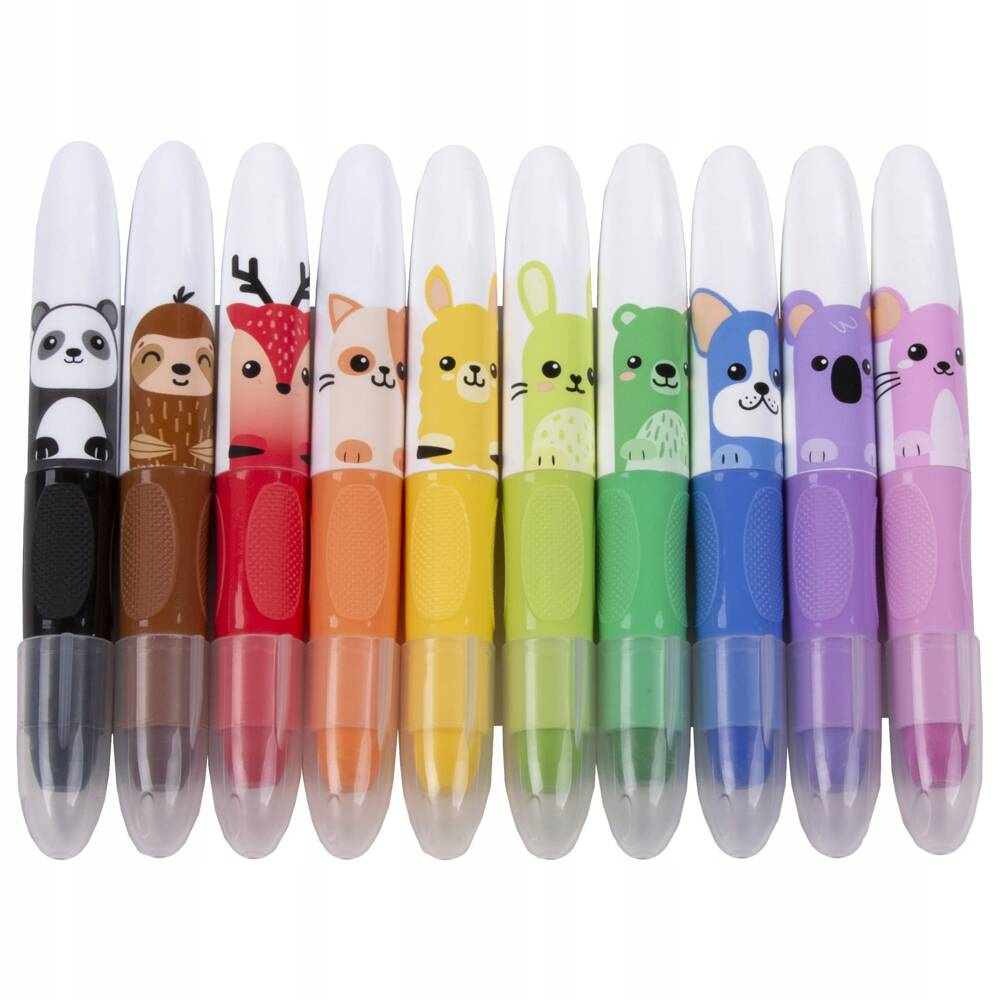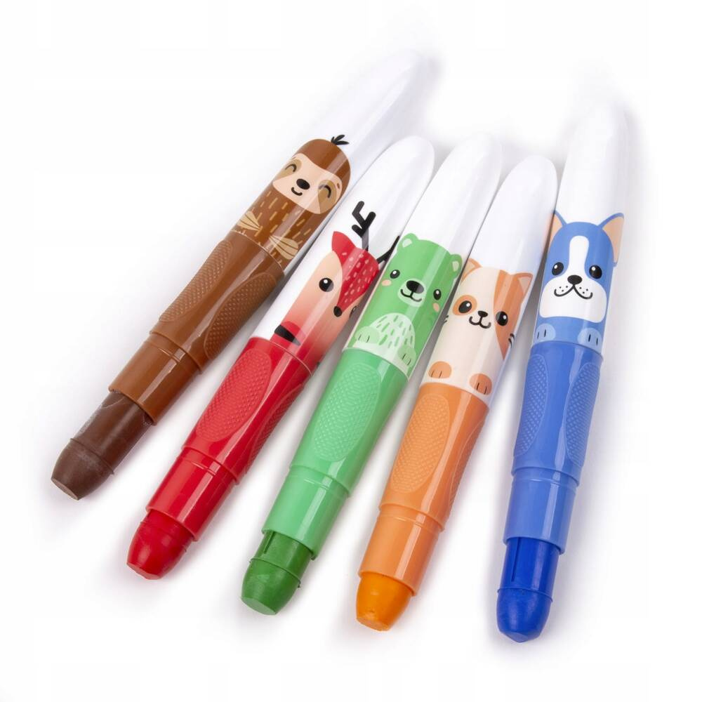 Kredki żelowe w 10 wyjątkowych odcieniach. Rysowanie nimi to czysta przyjemność, ruchy stają się takie płynne a efekt gładki. Dodatkowym atutem są przemiłe zwierzaki - na każdej kredce inny wzór. Są bardzo wydajne, miękkie i doskonale kryją. Świetnie sprawdzają się w kolorowaniu dużych powierzchni. Nie wymagają temperowania – ich wkład wysuwa się za pomocą pokrętła. Idealne dla dzieci, które dopiero rozpoczynają przygodę z plastyką. Uwaga! Kolorowanie nimi jest naprawdę wciągające…