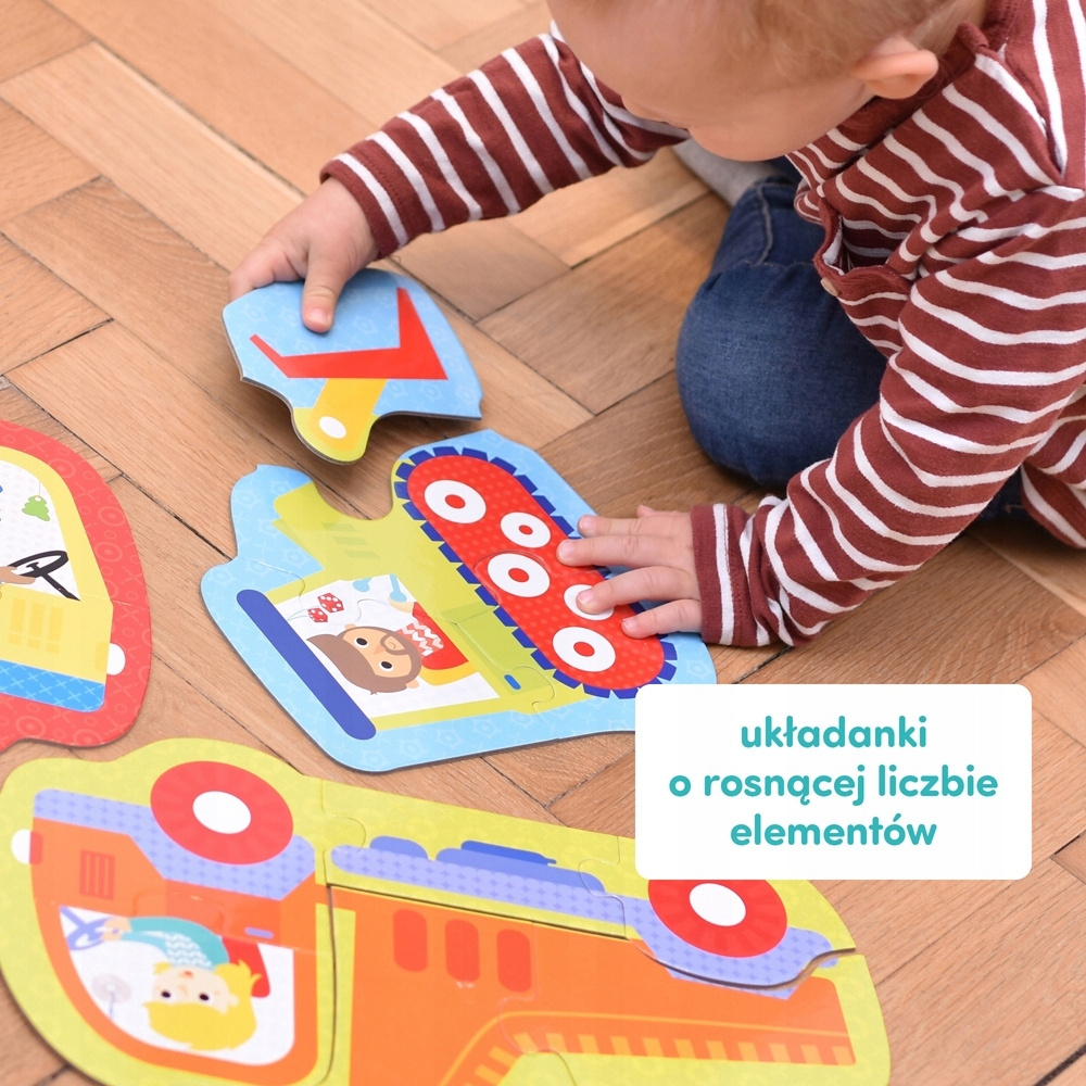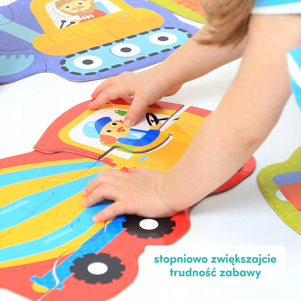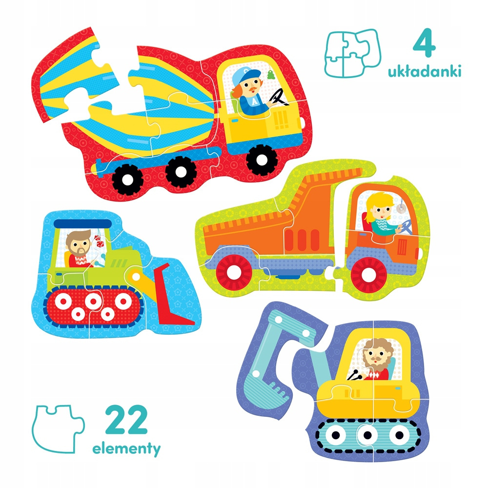Kolorowe, ogromne maszyny z placu budowy zachęcają dzieci do zabawy z puzzlami. W zestawie znajdują się 4 duże układanki o stopniowo rosnącej liczbie elementów, 4, 5, 6 i 7. W ich rozdzieleniu pomogą różne kolory tła. Zacznijcie od najprostszej układanki. Następnie kontynuujcie zabawę z kolejnymi pojazdami. Nazywajcie pojazdy i naśladujcie ich odgłosy. Wykorzystajcie je do przeróżnych zabaw. Maluchy mogą krok po kroku doskonalić układanie coraz trudniejszych puzzli, doskonale się przy tym bawiąc.