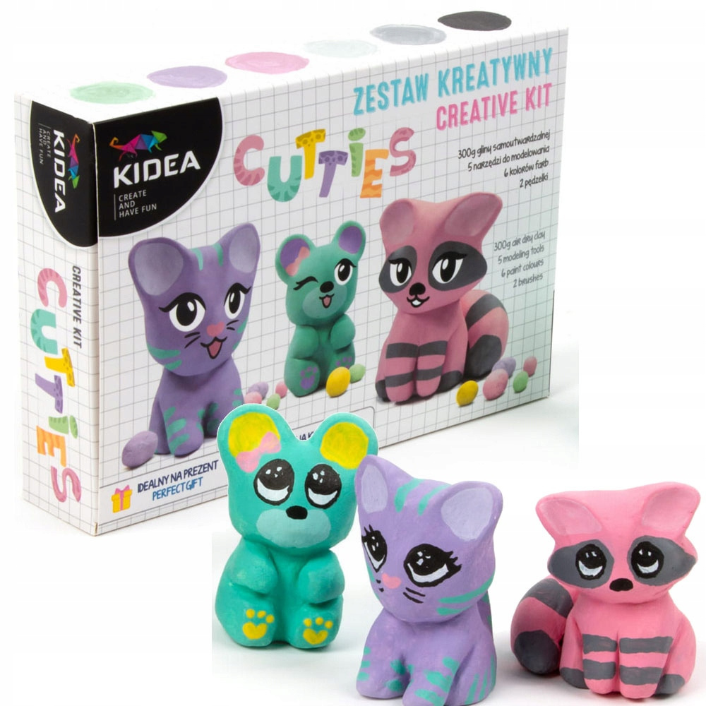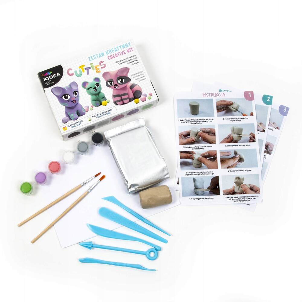 Podążając za krokami instrukcji i przy pomocy narzędzi można ulepić trzy zwierzaki - kotka, szopa oraz misia! Niezwykle kryjące farbki o pastelowych barwach nadają figurkom uroczy charakter. Gotowe figurki można podarować bliskiej osobie lub udekorować nimi na przykład biurko. Zestaw glina samoutwardzalna misie to świetny pomysł na wspólną, kreatywną zabawę z dzieckiem lub na wyjątkowy prezent.