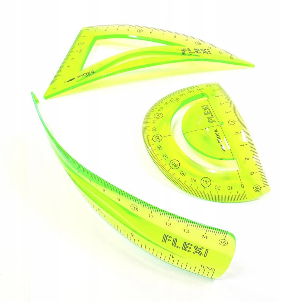 Zestaw geometryczny flexi przydatny szczególnie do pomiarów matematycznych. W zestawie 3 elementy: linijka 15 cm, ekierka, kątomierz, wykonane ze specjalnego, elastycznego tworzywa – odpornego na złamanie.
