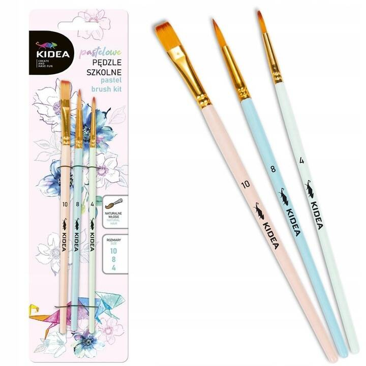 Pędzle do malowania Kidea z końcówką z naturalnym włosiem w 3 rozmiarach: 10, 8 i 4. Końcówki o różnych wielkościach i kształtach idealnie sprawdzą się podczas malowania detali, tła, czy mieszania kolorów na płótnie. Pastelowe kolory trzonów wyróżniają je spośród innych pędzli i pięknie prezentują się w szkolnym piórniku lub na biurku.