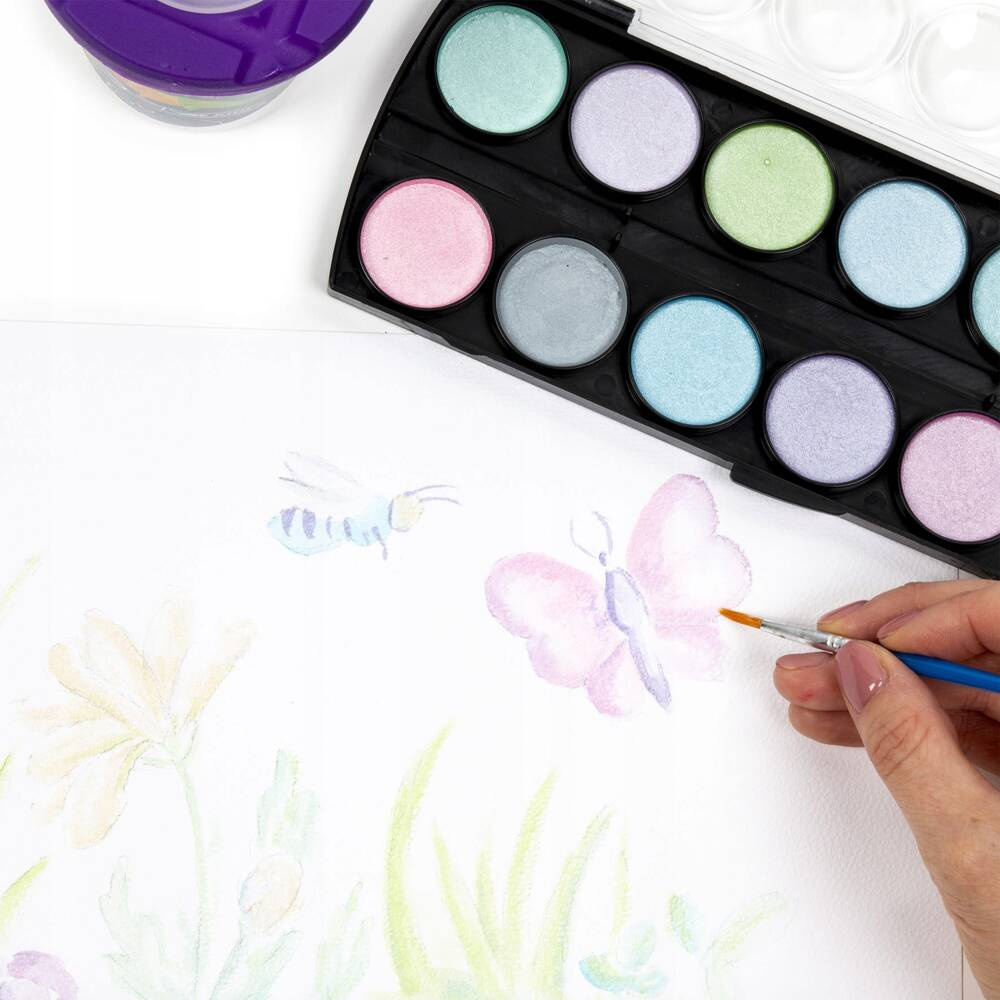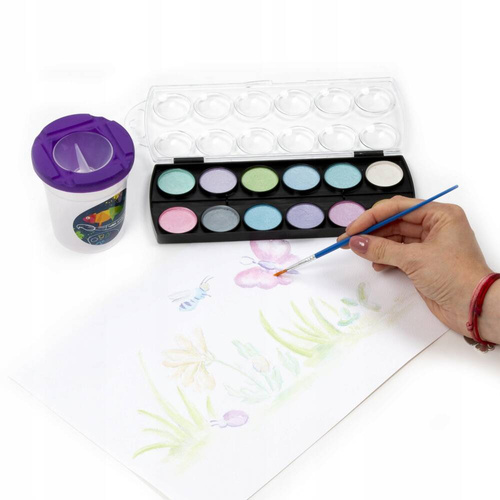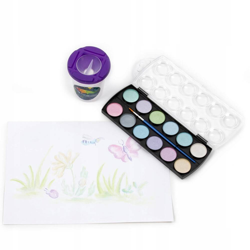 Farby akwarelowe w aż 12 metalicznych, błyszczących kolorach: srebrnym, kremowym, białym, dwóch odcieniach różu, zieleni i fioletu oraz trzech niebieskich odcieniach. Zestaw zawiera również pędzelek. Farbki dobrze kryją malowaną powietrznię, pozostawiając na niej metaliczny połysk. Zróżnicowana paleta barw pozwala na stworzenie jedynych w swoim rodzaju dzieł sztuki. Kolory można mieszać ze sobą, aby stworzyć jeszcze więcej odcieni. Metaliczne farby akwarelowe z pewnością zrobią furorę na lekcji plastyki.