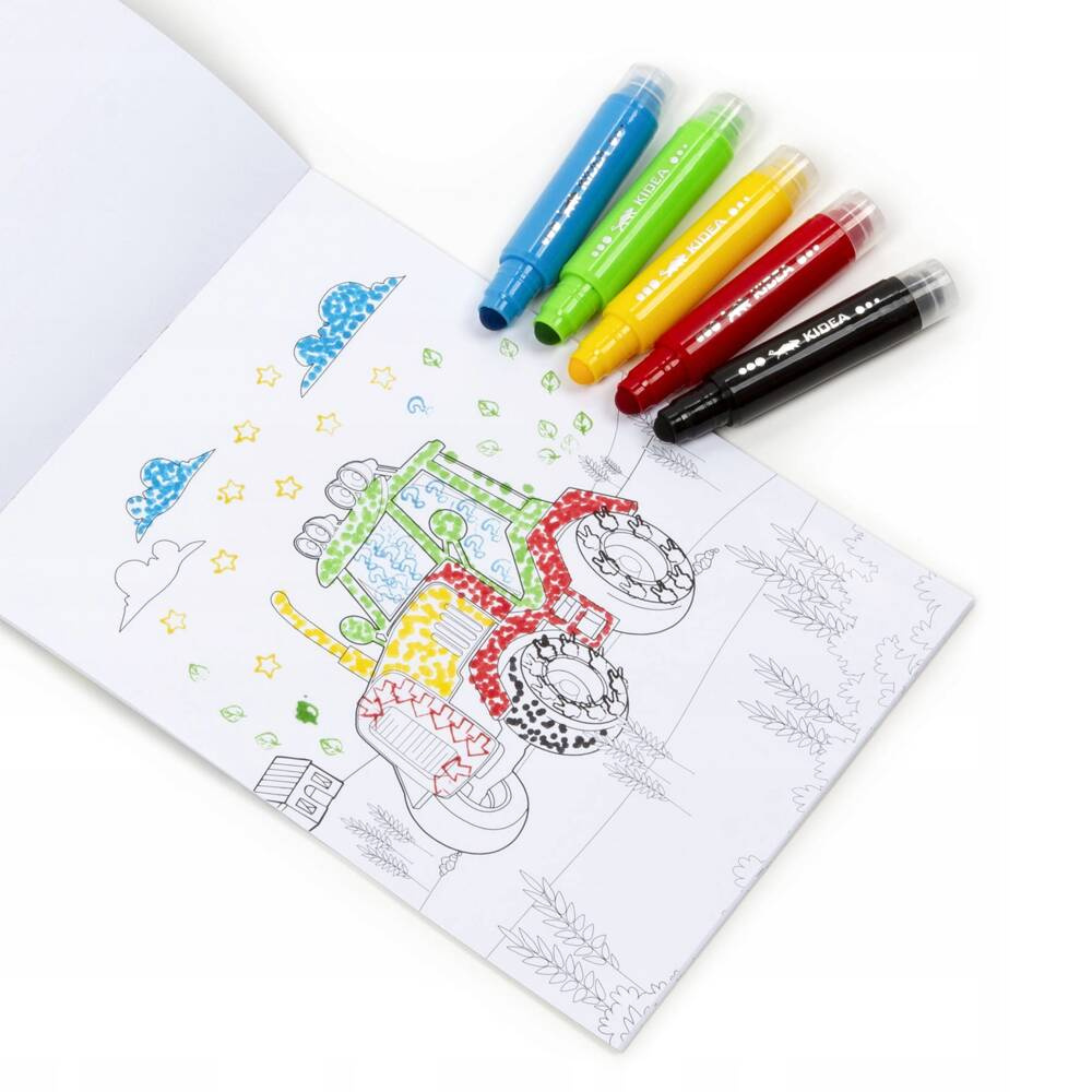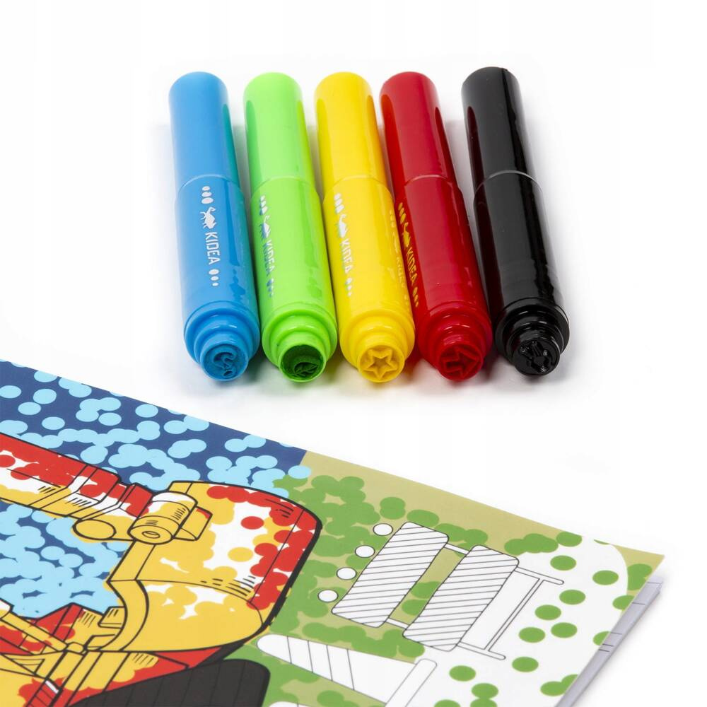 Zestaw Kidea zawiera kolorowankę z 10 arkuszami z obrazkami przeróżnych pojazdów oraz 5 kolorów dwustronnych flamastrów ze stempelkami: czerwony, zielony, niebieski, żółty i czarny. Końcówka flamastrów jest zaokrąglona i krótka, co ułatwia malowanie kropek na obrazkach. Stempelki na drugiej końcówce pisaka są samotuszujące, dzięki czemu nie trzeba używać dodatkowej poduszki z tuszem, a w dodatku mają ciekawe wzory, takie jak gwiazdki i listki. Malowanie kropkami to technika, która rozwija u dziecka koordynację ręka-oko, poprawia sprawność manualną, uczy koordynacji, a przede wszystkim rozwija wyobraźnię.