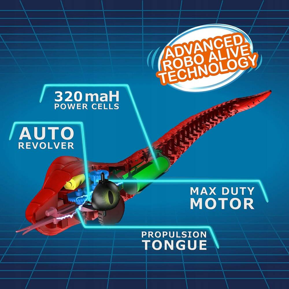 - Realistyczna zabawka porusza się z niezwykłą zwinnością, macha złowrogo językiem i porusza oczami wypatrując kolejnej ofiary!