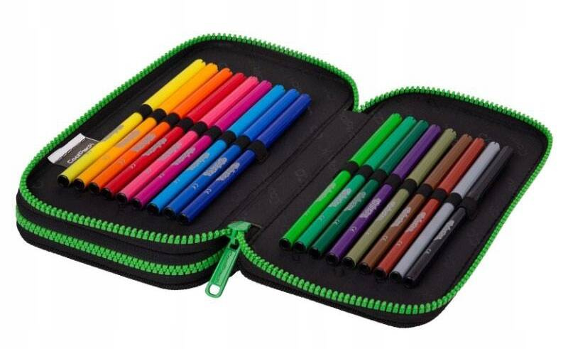 - W pierwszej komorze znajduje się 12 kolorowych kredek, ołówek, długopis, linijka do 15 cm, temperówka i gumka do ścierania, a drugiej komorze umieszczono 18 kolorowych mazaków. Wszystko jest zatem pod ręką i nie musisz martwić się o zawartość szkolnego wyposażenia.