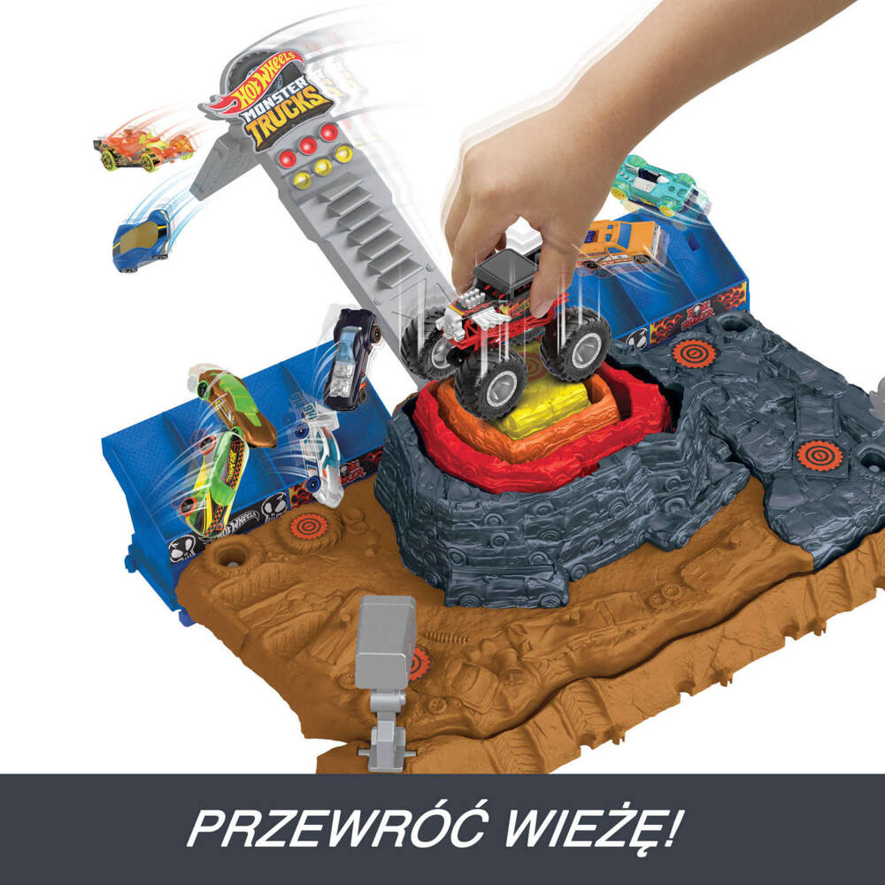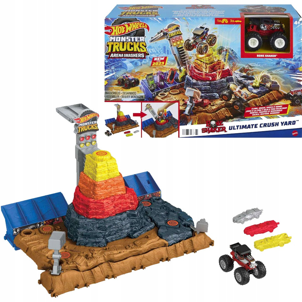Zawartość: 1 zestaw Hot Wheels Monster Trucks Arena Smashers™ Bone Shaker™ Piramida Demolki, 1 pojazd Hot Wheels® Monster Trucks Bone Shaker™ w skali 1:64 i 3 autka do „zgniatania”.