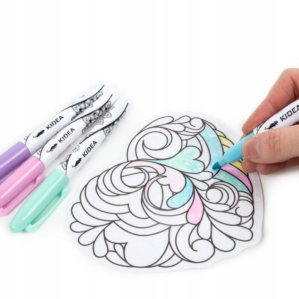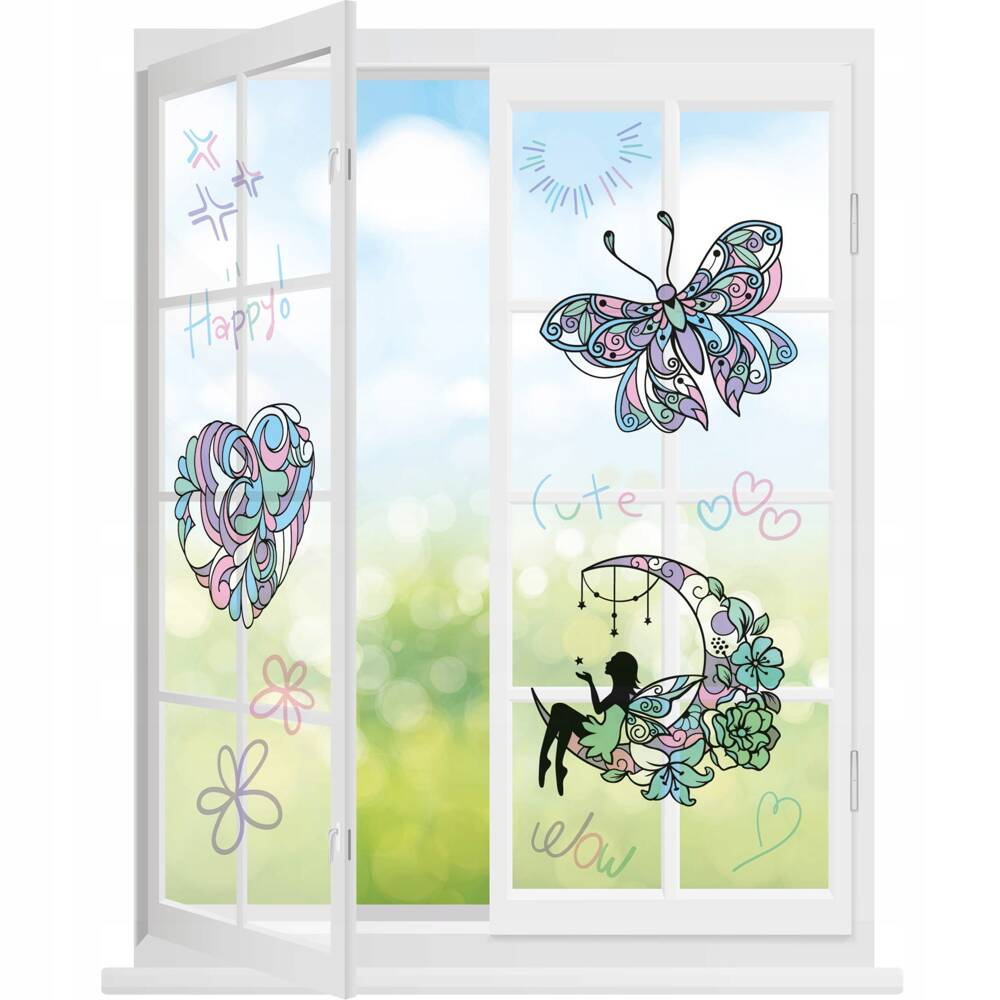 Witraże na okno z pisakami. Adhezyjne naklejki bez użycia kleju utrzymują się na gładkiej powierzchni dzięki działaniu sił elektrostatycznych. Bez problemu można przyklejać je i odklejać bez niszczenia okna lub lustra. W opakowaniu znajdują się trzy witraże: wróżka, motylek i serce oraz cztery pisaki w pastelowych kolorach: zielonym, fioletowym, różowym i niebieskim. Umieszczając witraże na oknie uzyskamy niezwykły efekt kolorowych promieni słonecznych wypełniających pomieszczenie. Witraże na okno to nie tylko piękna dekoracja pokoju dziecięcego, ale również wyjątkowy prezent dla bliskiej osoby.