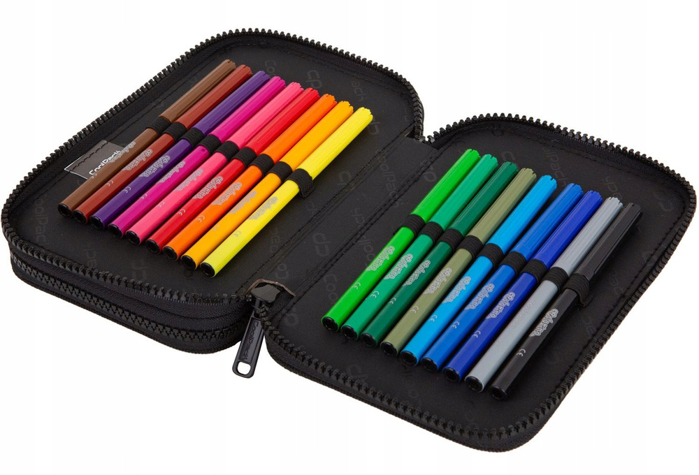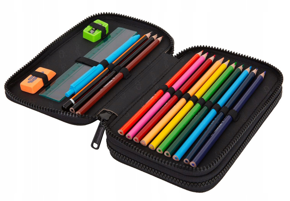 - W pierwszej komorze znajduje się 12 kolorowych kredek, ołówek, długopis, linijka do 15 cm, temperówka i gumka do ścierania, a drugiej komorze umieszczono 18 kolorowych mazaków. Wszystko jest zatem pod ręką i nie musisz martwić się o zawartość szkolnego wyposażenia.
