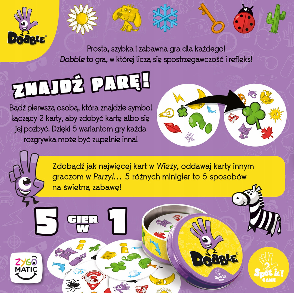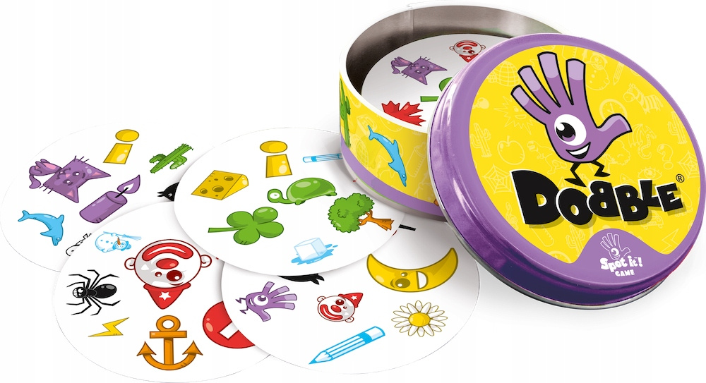 Dobble to niezwykle uniwersalna gra karciana, która równie dobrze sprawdzi się do zabawy z dziećmi, jak i na imprezy dorosłych. Podczas rozgrywek staramy się jak najszybciej znaleźć i nazwać symbol łączący dwie karty, by (w zależności od trybu gry) pozbyć się karty lub ją zdobyć. 55 kolorowych kart jest zamkniętych w solidnej, metalowej puszce, dzięki czemu z łatwością możemy zabrać grę ze sobą z dowolne miejsce, a instrukcja opisuje aż 5 wariantów zabawy, która dzięki temu nigdy się nie nudzi.