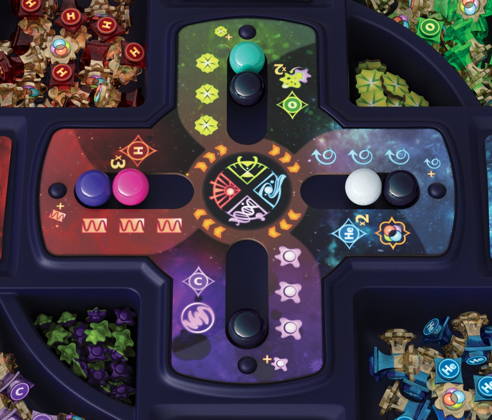 - Zgromadzone zasoby wydajemy w fazie budowania. Dzięki nim możemy tworzyć mgławice, zdobywać gwiazdy i przekształcać je w supenowe, a także dbać, by pojawiające się protożycie stabilnie się rozwijało. Oprócz zgromadzonej puli zasobów do wykorzystania mamy też karty zdolności usprawniające pracę kreatorów światów.