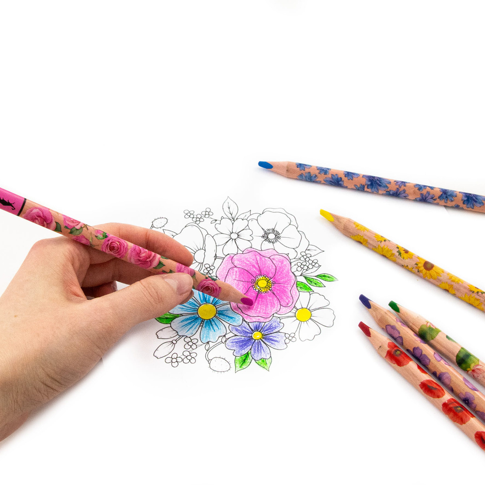 Każda kredka ozdobiona jest realistycznym kwiatowym wzorem, co sprawia, że rysowanie staje się jeszcze przyjemniejsze!