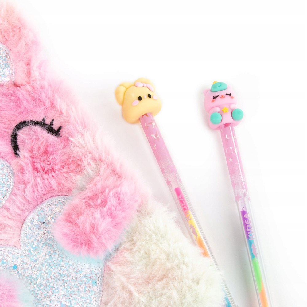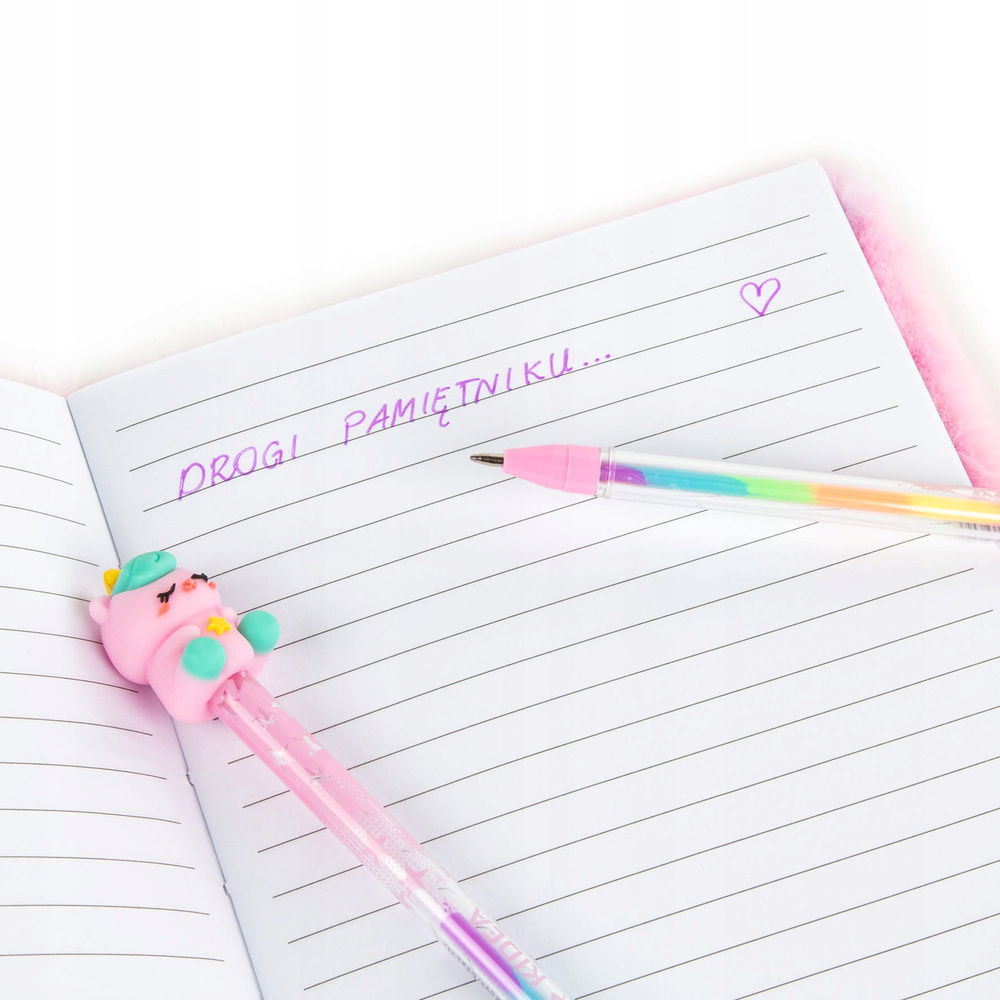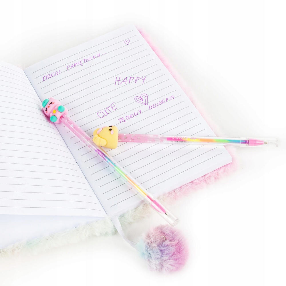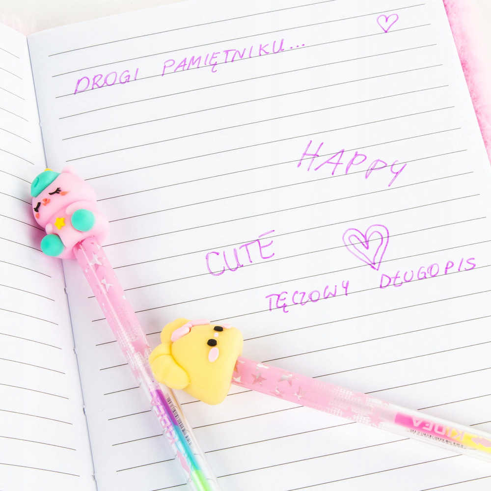 - Tęczowy korpus – stylowy i przyciągający wzrok, idealnie komponuje się z dekoracyjną figurką na końcu długopisu