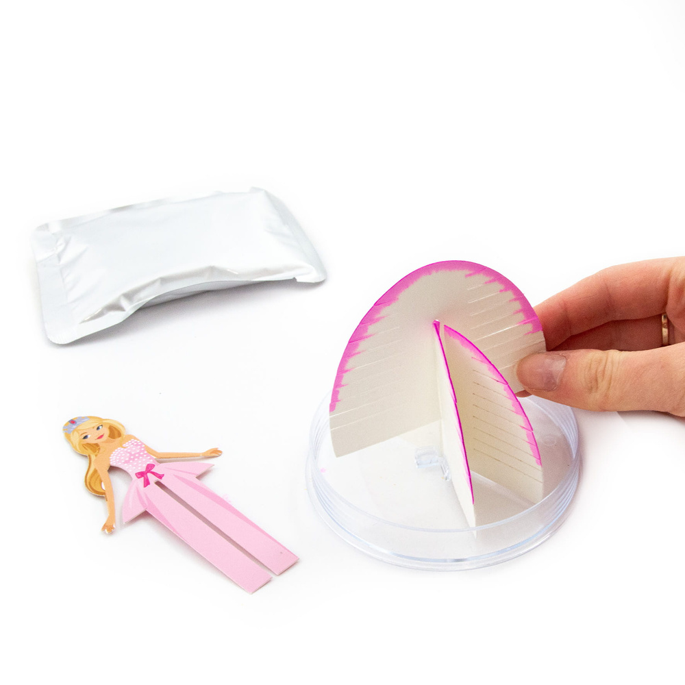 Po złożeniu konstrukcji wystarczy polać sukienkę magiczną wodą i... obserwować zaczynającą się przemianę! Już po około 60 minutach suknia zacznie pokrywać się delikatnymi, barwnymi kryształkami, które z każdą godziną tworzą coraz bardziej imponującą, bajkową kreację.