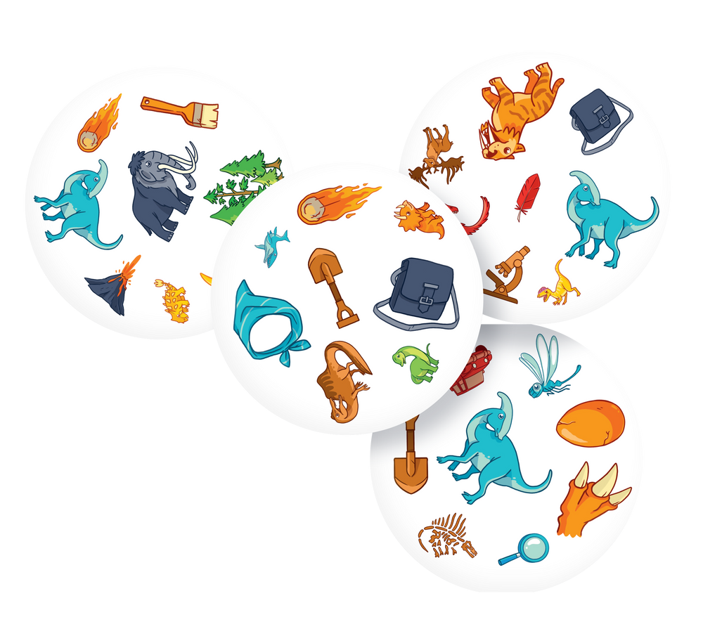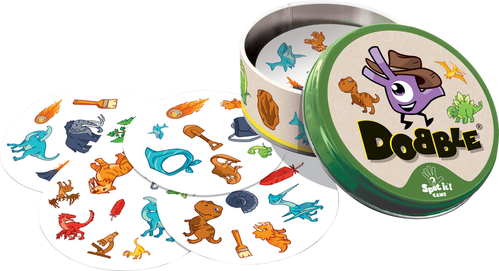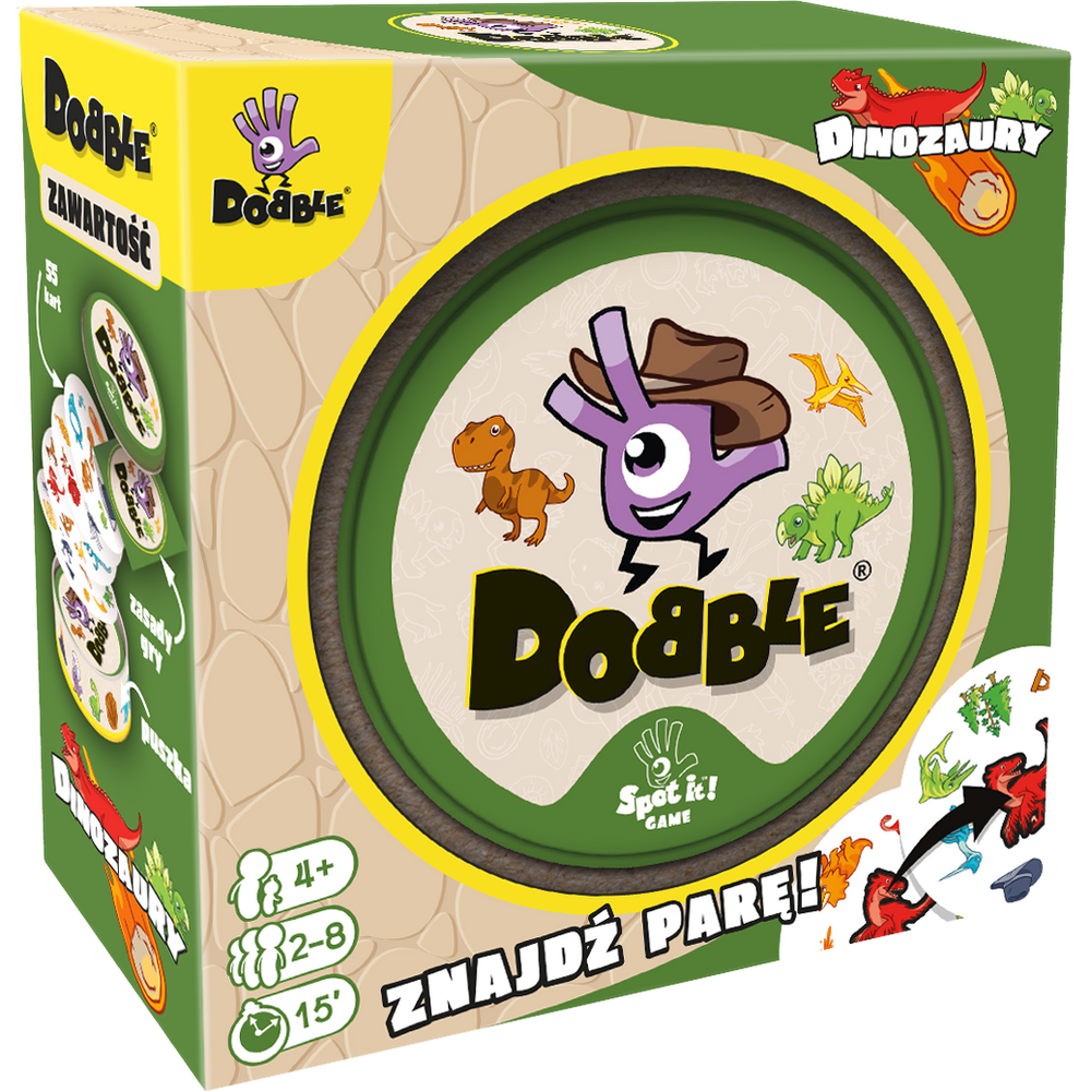 Dobble Dinozaury to gra wspierająca trening spostrzegawczości i szybkości reakcji, w pełni dostosowana do potrzeb najmłodszych. Zestaw zawiera 55 kart z najpopularniejszymi dinozaurami i innymi prehistorycznymi zwierzętami oraz przedmiotami kojarzącymi się z wykopaliskami. Wyraziste, kolorowe obrazki łatwo nazwać, dzięki czemu możemy zaprosić do zabawy dzieci od 4. roku życia.